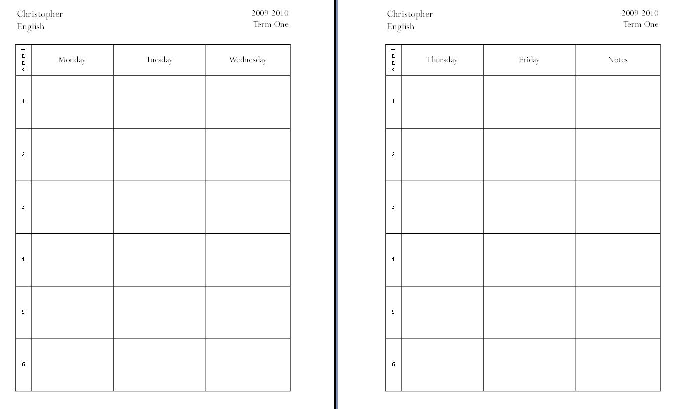 Then each subject is laid out for the 12 weeks on planning pages. I have five columns for days of the week and one column for notes, the 6 weeks per page so each subject is a 4 page spread. This allows me enough space for writing. I made these with MS Publisher, but you could use just about any word processing program or even a spreadsheet. Or you can find printable planning sheets online.